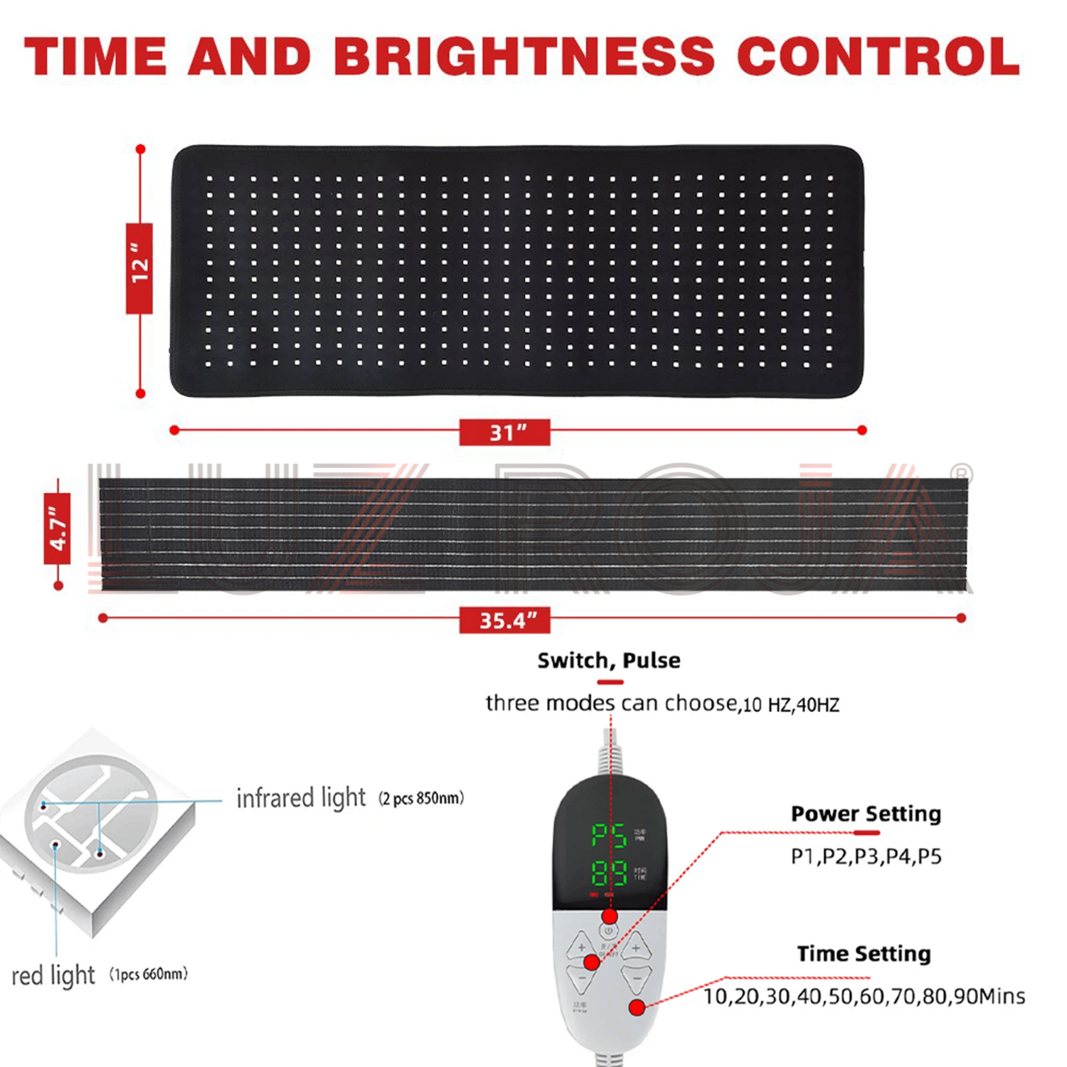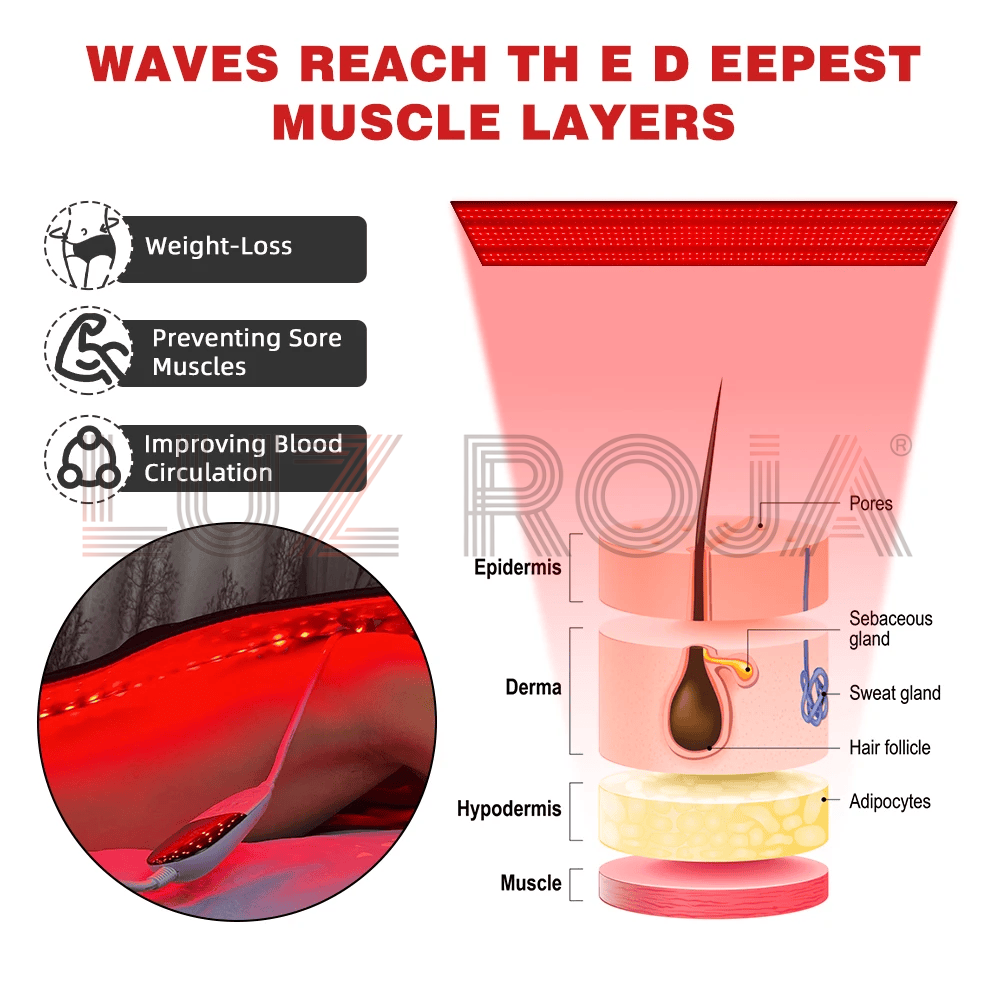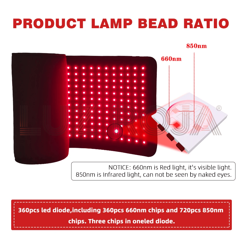 Luz Roja e Infrarrojo Combinado: Este dispositivo cuenta con 360 LEDs de grado médico, que incluyen tanto luz roja como luz infrarroja cercana, para una terapia profunda y efectiva. La luz estimula la circulación sanguínea, alivia el dolor, relaja los músculos y acelera la curación.